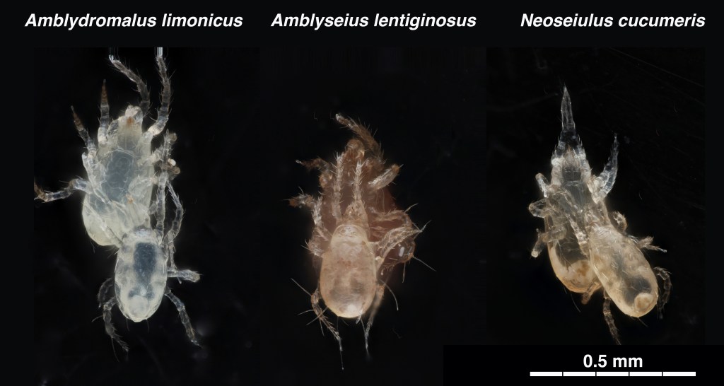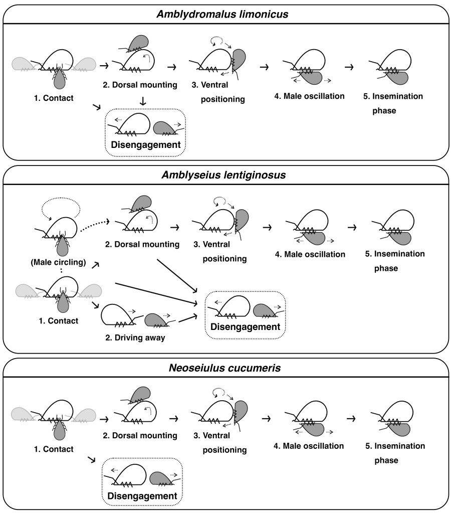 In three closely studied species—Amblydromalus limonicus, Amblyseius lentiginosus, and Neoseiulus cucumeris—this process follows five clear stages: contact, mounting, positioning, oscillation (a kind of shaking movement), and finally insemination. Despite being small and often overlooked, these mites show surprising complexity in their reproductive behaviour—each move fine-tuned by evolution to ensure the next generation.